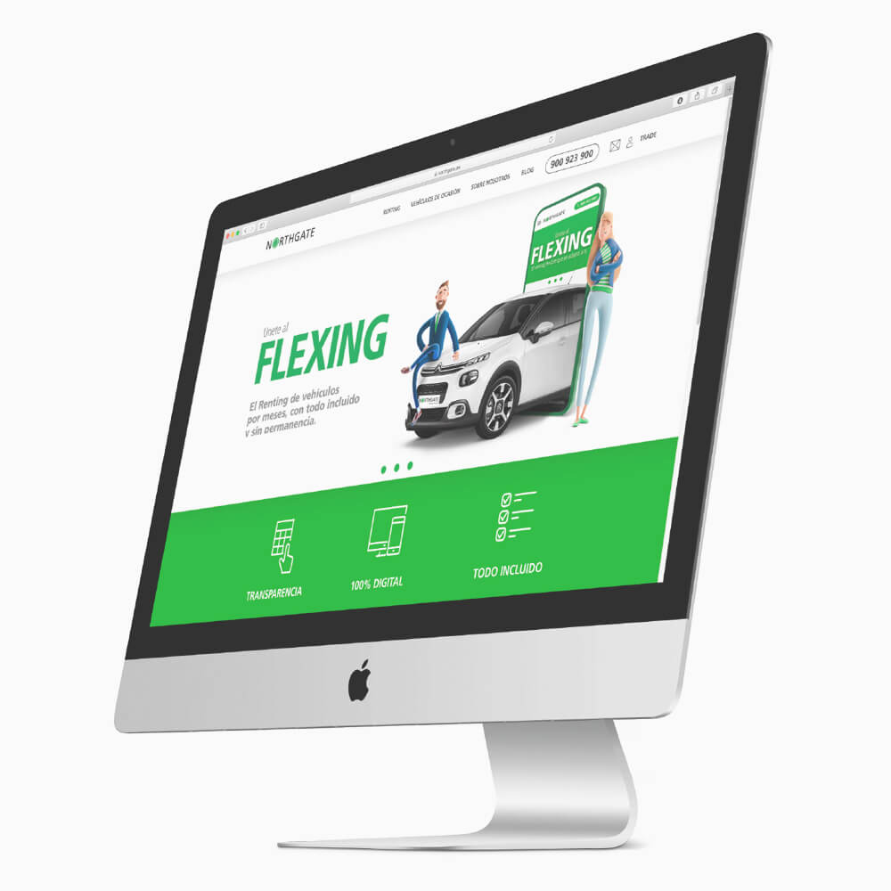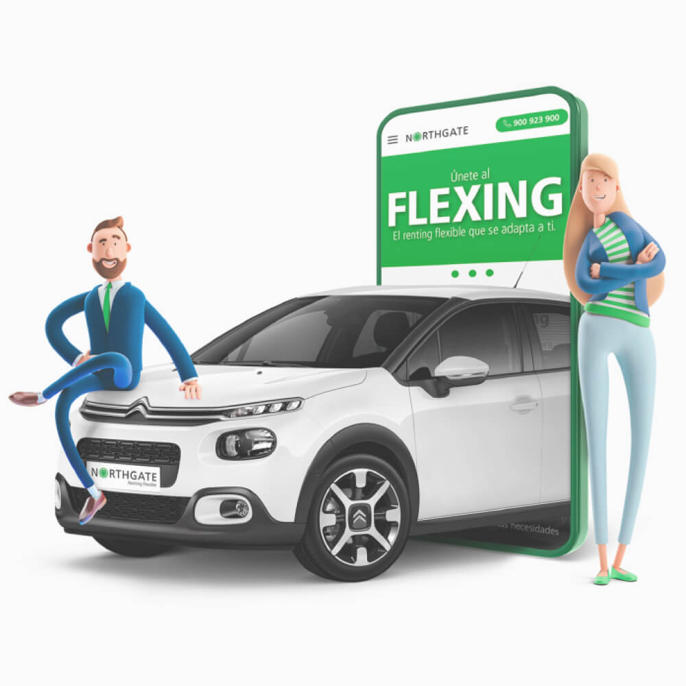 A partir de esta premisa, desarrollamos el concepto de la campaña y la imagen que se utilizaría en su promoción. La idea central fue fusionar los términos «Flexible» y «Renting» para crear «FLEXING», una nueva palabra que fuera fácil de recordar y comprender. Para la imagen, diseñamos a nuestros protagonistas: personajes en 3D que representaban las diferentes tipologías de clientes. Estos recursos gráficos proporcionaron gran versatilidad, permitiéndonos utilizarlos en diversos entornos y plataformas.