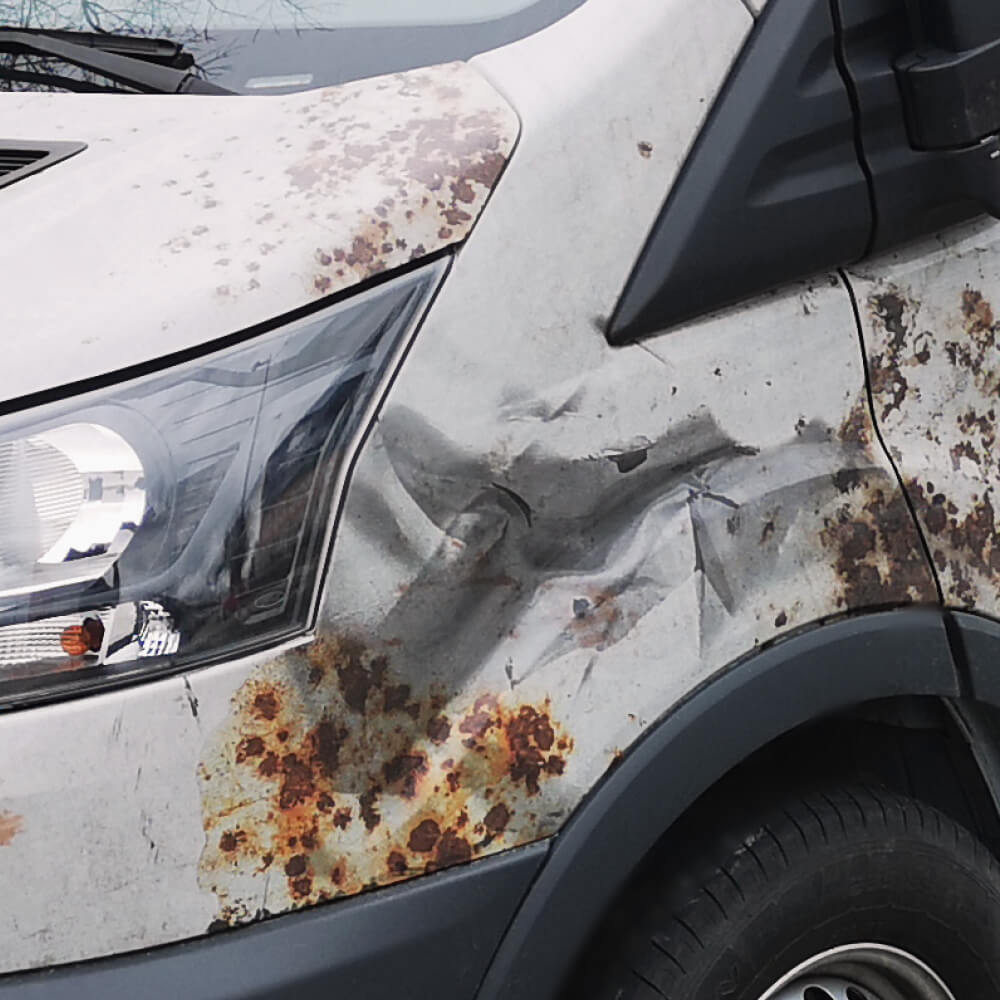 Nuestra idea inicial fue adquirir furgonetas en mal estado y vinilarlas con mensajes impactantes. Buscábamos que las furgonetas lucieran oxidadas y verdaderamente deterioradas. Sin embargo, nos enfrentamos a un obstáculo legal que impedía que estos vehículos circulasen. La solución fue vinilar furgonetas nuevas para simular un efecto de oxido y desgaste, añadiendo arañazos, abolladuras y marcas de pintura que cumplían perfectamente su función.